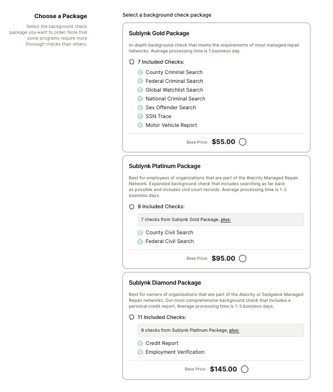 Each Managed Repair Network you work with has their own unique requirements for Background checks. Sublynk makes it easy to either upload an existing Background Check or to purchase one through a reputable partner (Checkr).