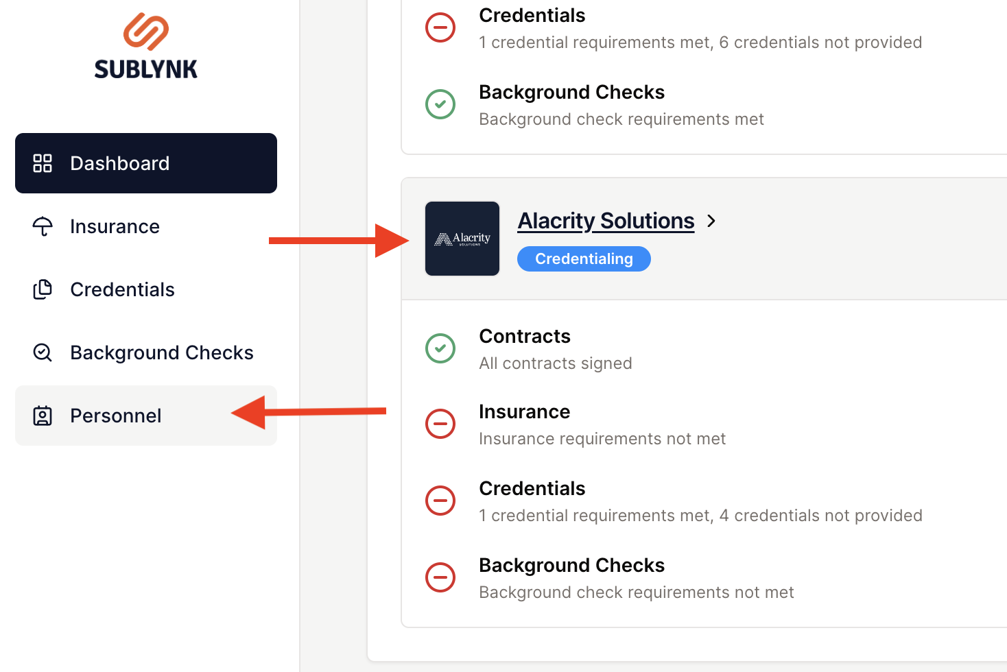 You can view your Alacrity network status on the dashboard, and you must be in a credentialing or compliant status with Alacrity to send your VCC forms.