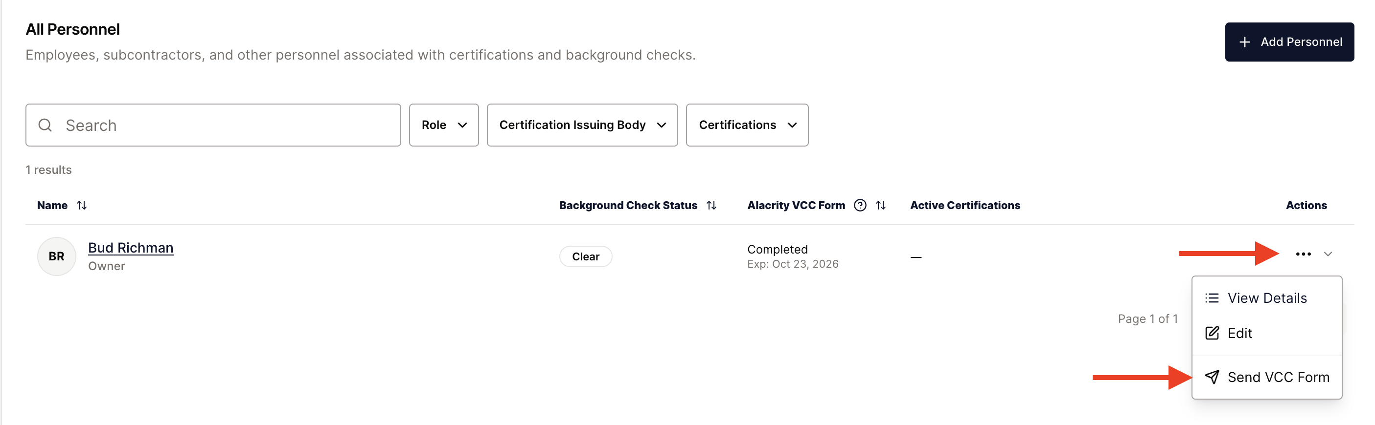 Once you are in your personnel table you can view the last VCC form status for anyone on your personnel table. You can also send a new VCC form using the action dots on the right side of a personnel table entry: