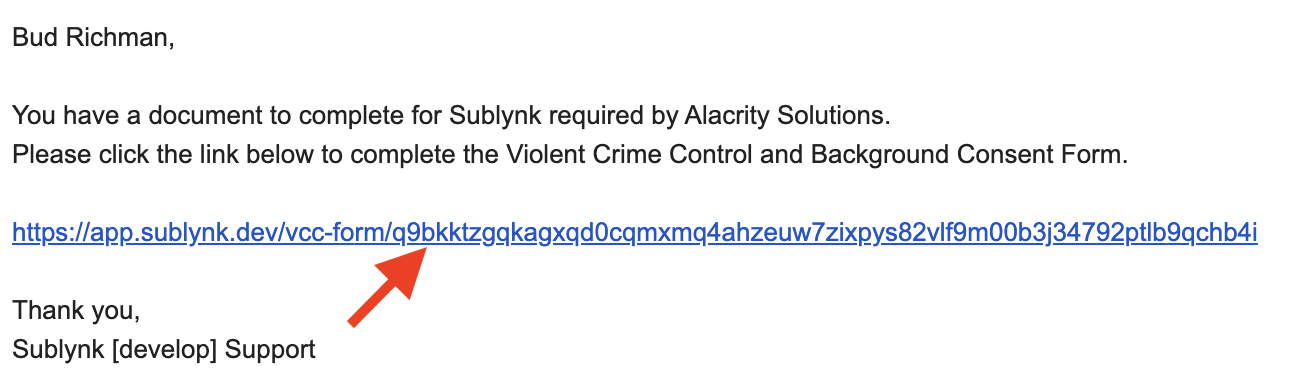 The VCC form will arrive by email to the contact email provided to Sublynk for the personnel member. That individual will receive an email with a link they need to click on to complete the form: