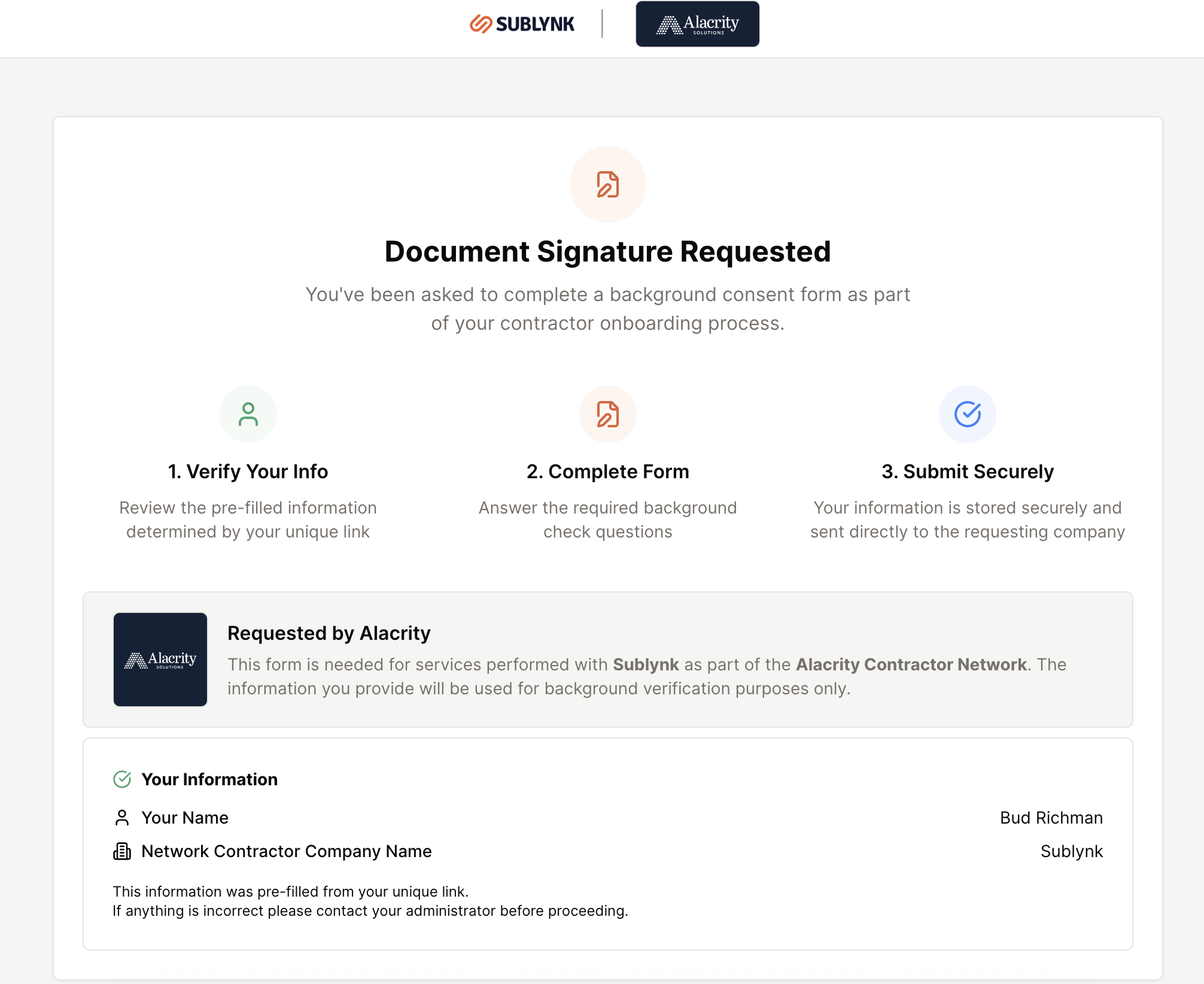 After the individual completes the form it will be updated in the Sublynk system. Your personnel table will reflect the latest completed VCC form time and date. Alacrity will also receive a copy of that VCC form automatically for their records.